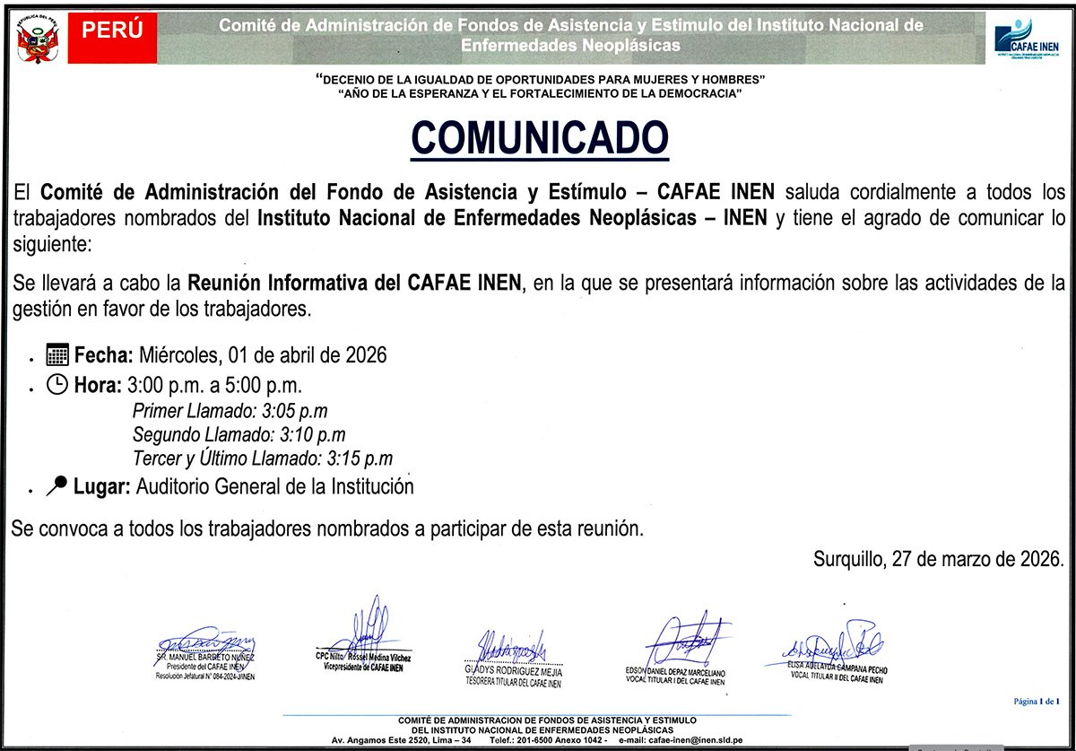 EI CAFAE INEN es una organización que tiene por finalidad administrar fondos económicos y financieros para brindar estímulo y asistencia que contribuya al bienestar y eficiencia laboral del trabajador del Instituto Nacional de Enfermedades Neoplásicas INEN, así como también promover actividades académicas, recreativas, sociales, culturales y deportivas